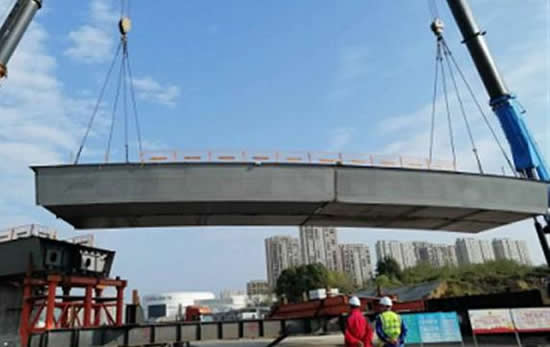 第2聯(lián)橋梁需要跨越寧杭南路S6地鐵區(qū)域,由于地鐵較淺,跨度大,設(shè)計(jì)采用鋼箱梁結(jié)構(gòu)。鋼箱梁長(zhǎng)度118米,高2米,采用單箱雙室結(jié)構(gòu)薄壁結(jié)構(gòu),總重量652噸。
