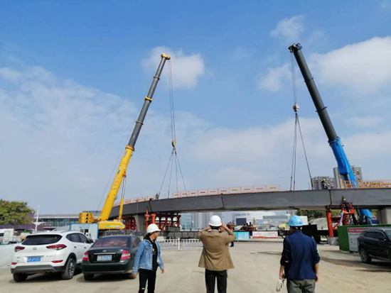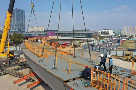 工程于2021年10月1日開工。目前道路工程路基施工已經(jīng)全部結(jié)束。路面結(jié)構(gòu)層正在施工。連接寧杭南路和勤學(xué)路及站房的A匝道橋全長(zhǎng)894.194米,中間落客平臺(tái)區(qū)域?yàn)?1米寬,其余區(qū)域?yàn)?~10米寬。橋梁上部結(jié)構(gòu)為8聯(lián)預(yù)應(yīng)力砼結(jié)構(gòu)箱梁,1聯(lián)鋼箱梁結(jié)構(gòu)。目前預(yù)應(yīng)力箱梁結(jié)構(gòu)全部施工張拉完畢,難度最大的為第2聯(lián)鋼箱梁正在施工。