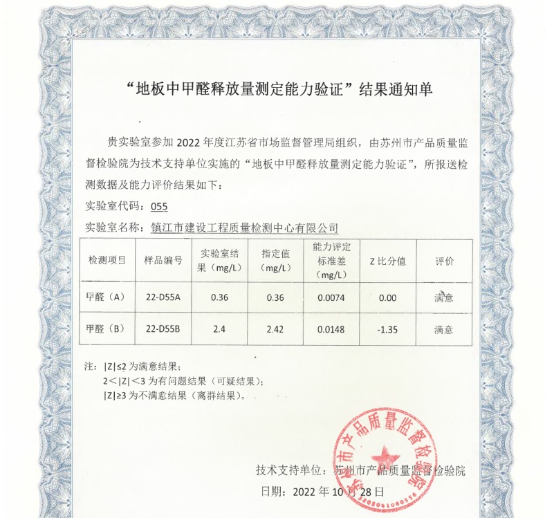 根據(jù)省市場監(jiān)管局關(guān)于開展 2022 年江蘇省檢驗檢測機構(gòu)能力驗證工作的通知,檢測中心參加了由江蘇省市場監(jiān)督管理局組織,蘇州市產(chǎn)品質(zhì)量監(jiān)督檢驗院實施的“地板中甲醛釋放量測定”的能力驗證。